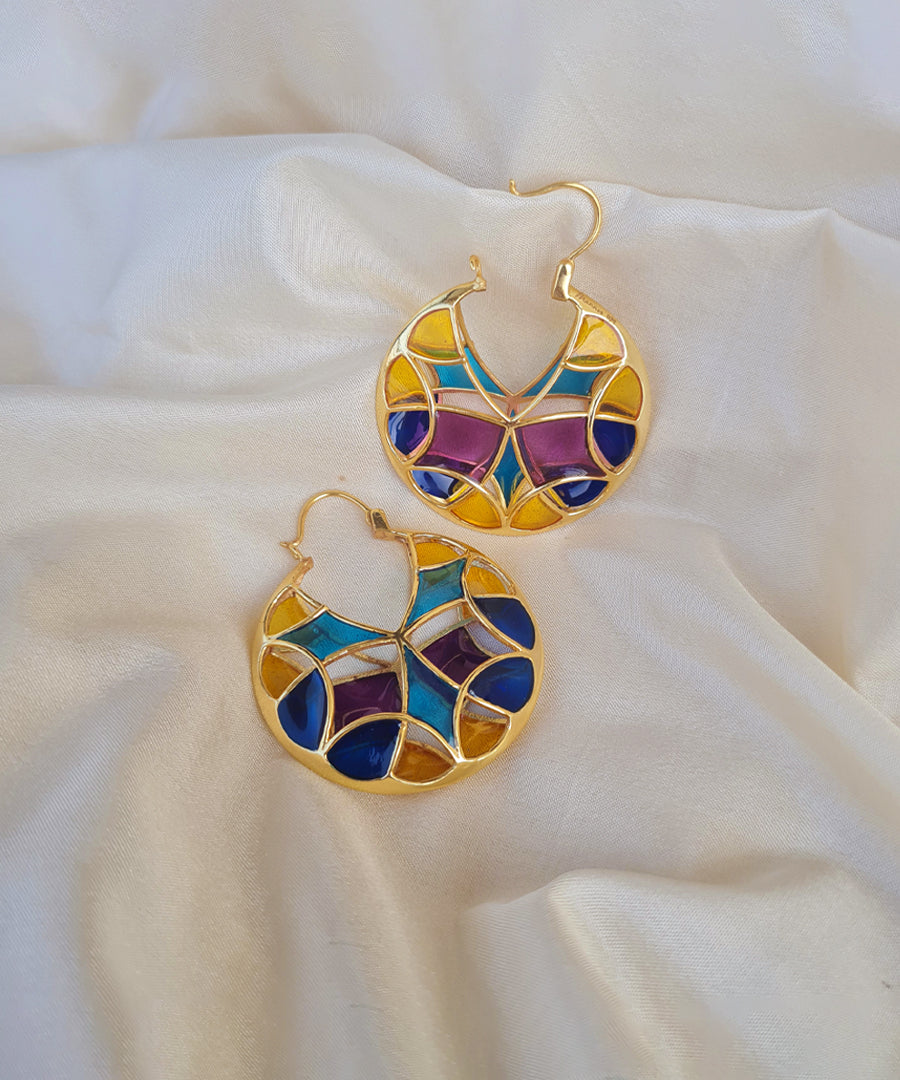 These earrings are handcrafted in 92.5% silver, with thick luxurious gold plating, has transparent enamel details in vibrant colors & has a ear wire lock mechanism which is super easy to wear.