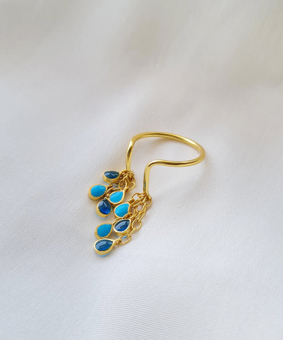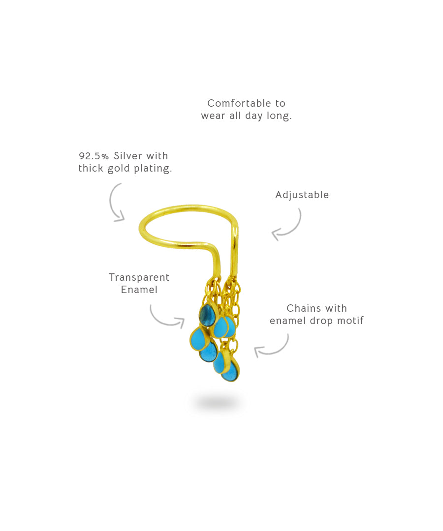 This adjustable statement ring features delicate enamel work in soft, pastel blue tones—evoking serenity and timeless charm. Suspended from its adjustable base are dainty gold chains, each ending in an enamel drop motif that dances gently with every movement.