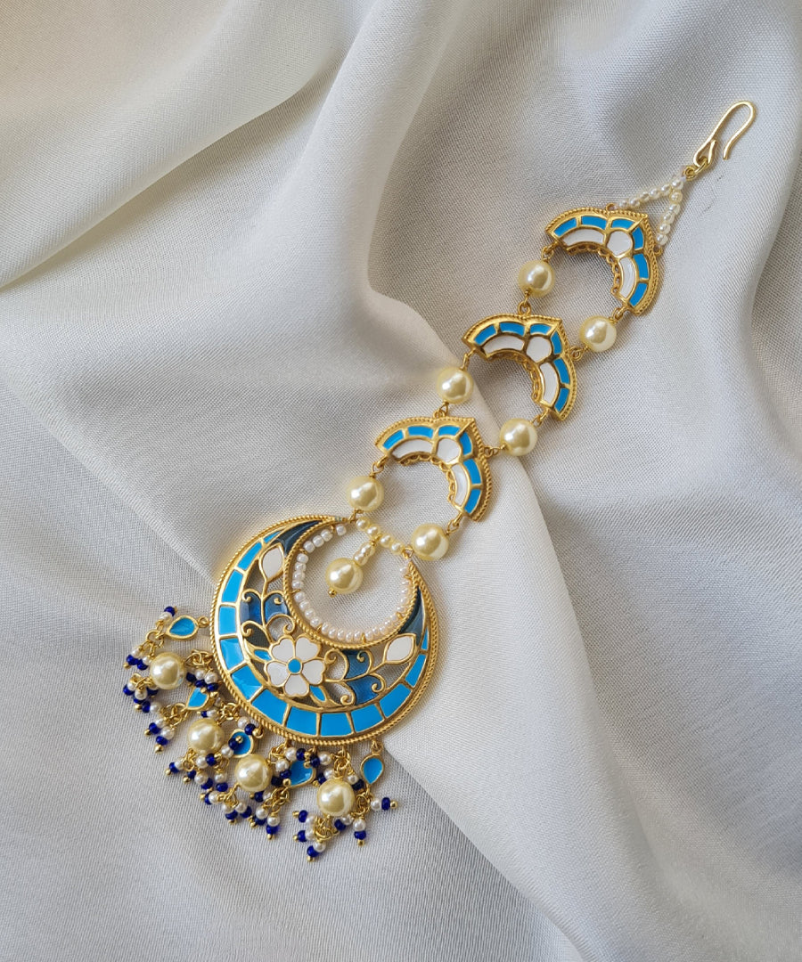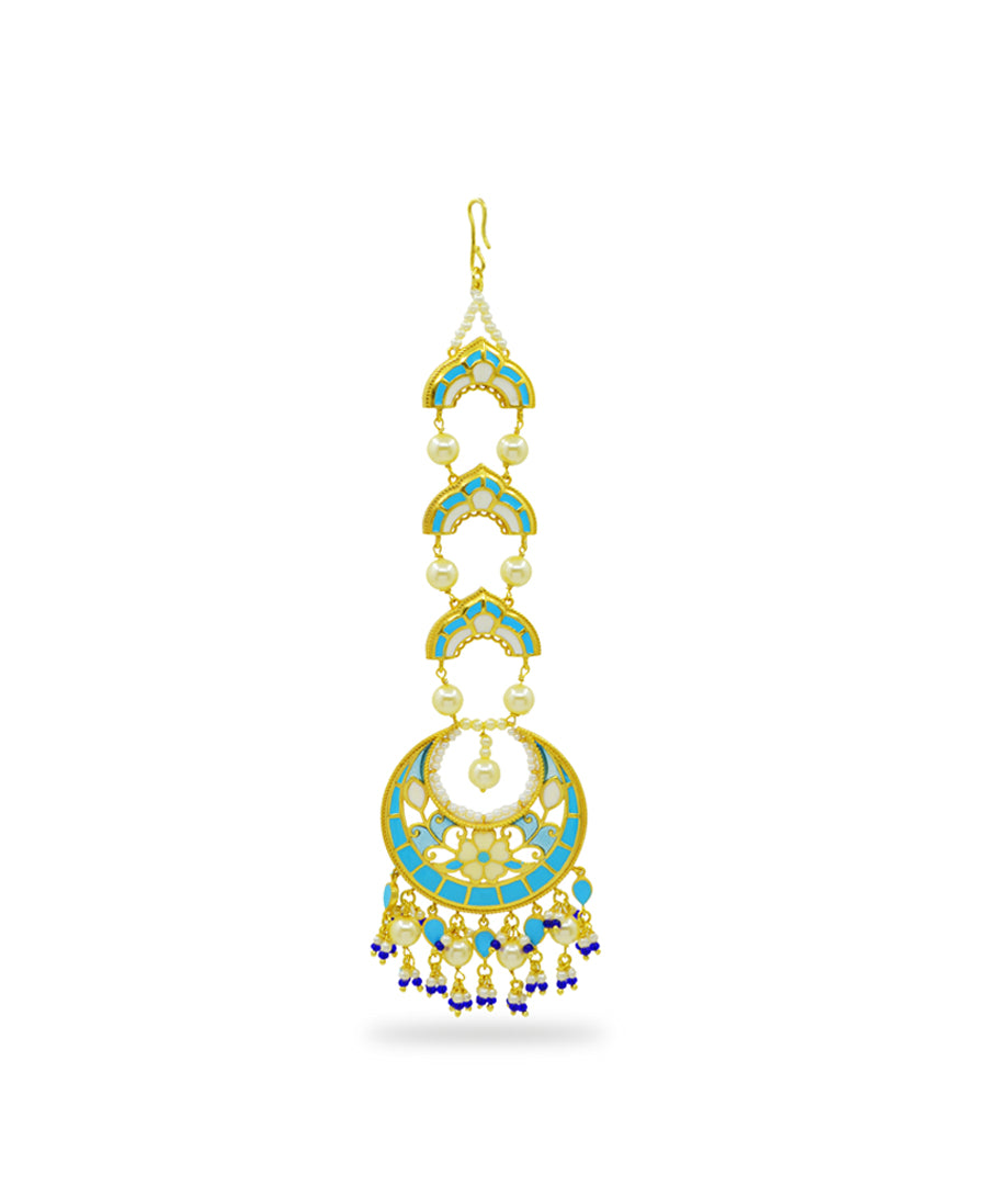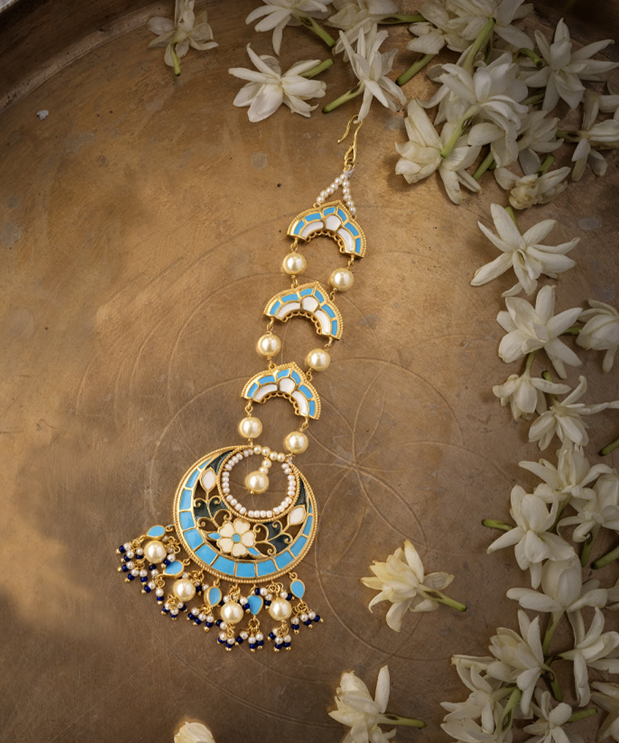 Intricate enameling work adorns elegant motifs, featuring delicate hanging pearls and beads for graceful movement. Worn at the center of the forehead, this designer maangtika beautifully frames your face. With roots tracing back centuries, the maangtika is a traditional Indian jewelry piece symbolizing prosperity and good fortune. An integral part of bridal jewelry, it represents a timeless legacy.