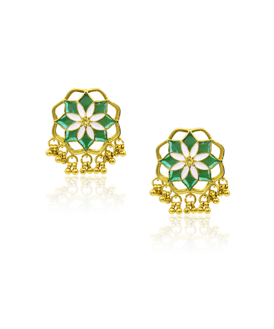 These small studs are handcrafted in 92.5% sterling silver, with thick gold plating and has a transparent enamel details in vibrant color, with flower motif design. These earrings are handcrafted with delicate details and hanging ghungroo's in gold finish with post and back push mechanism.