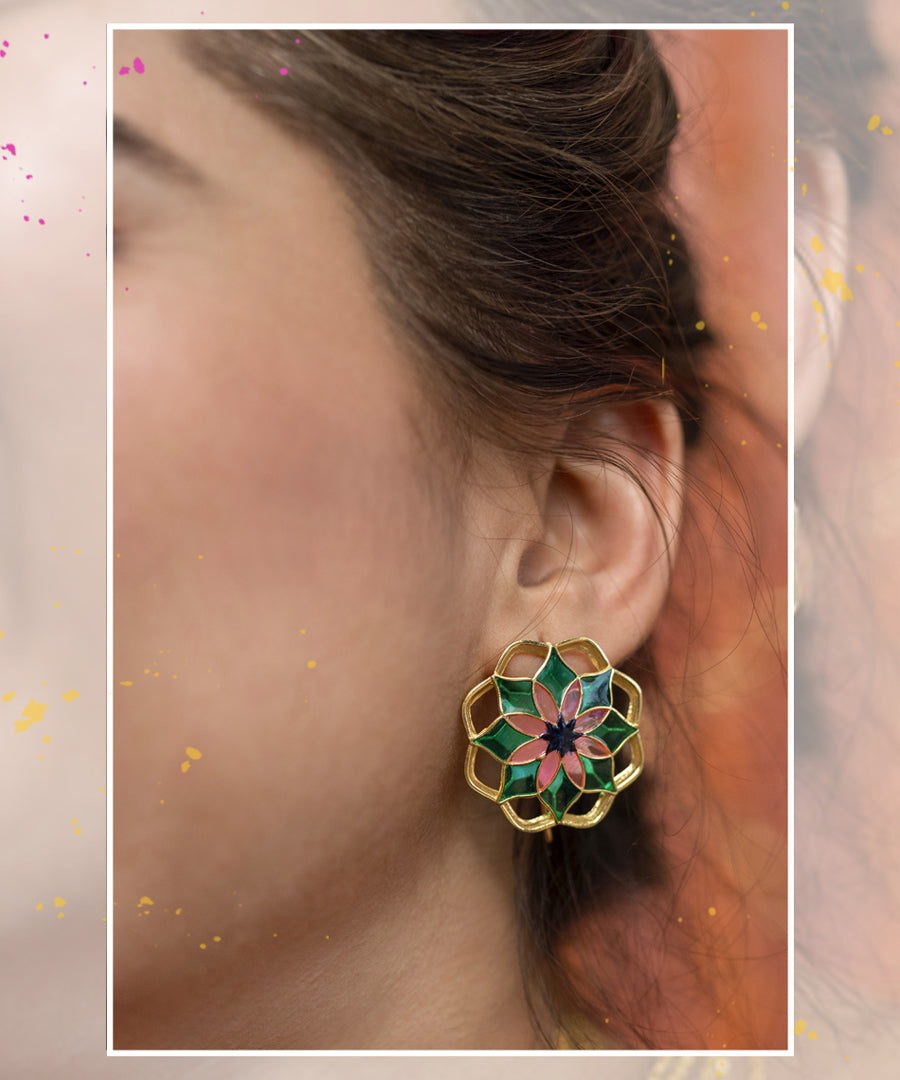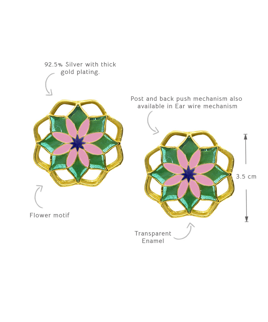 These studs are handcrafted in 92.5% sterling silver, with thick gold plating. It has transparent enamel details in vibrant color, with flower motif design. Comes in a post and back push mechanism also available in ear wire mechanism.