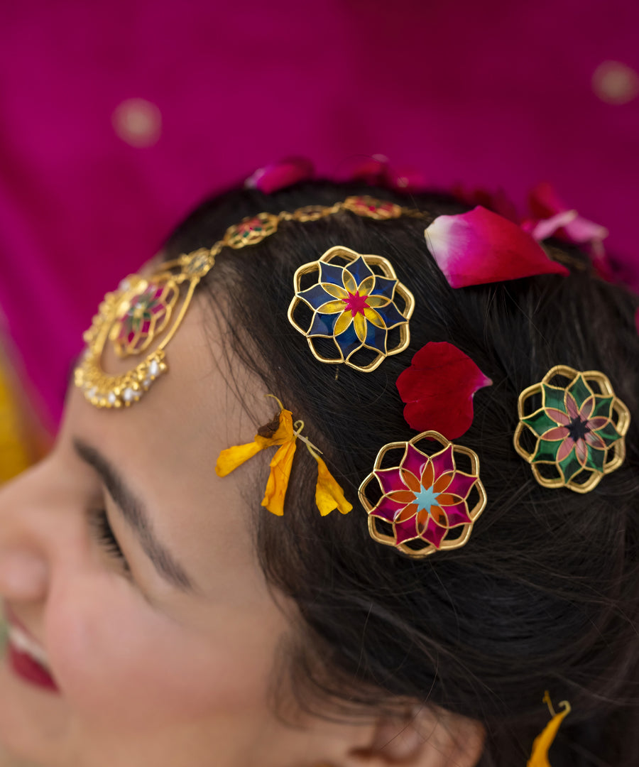 Mystic motifs inspired by the falling flowers, frozen like a moment in time. The radiance of plique-à-jour enamel brings out the vibrancy and playfulness of gulmohar flowers.