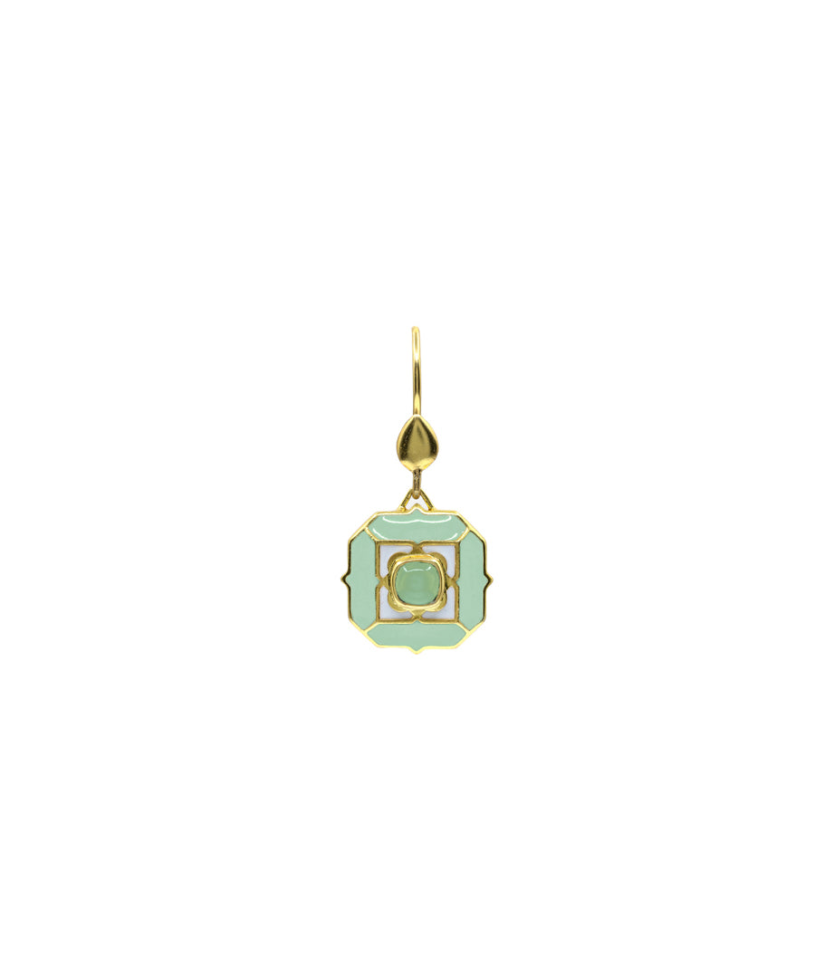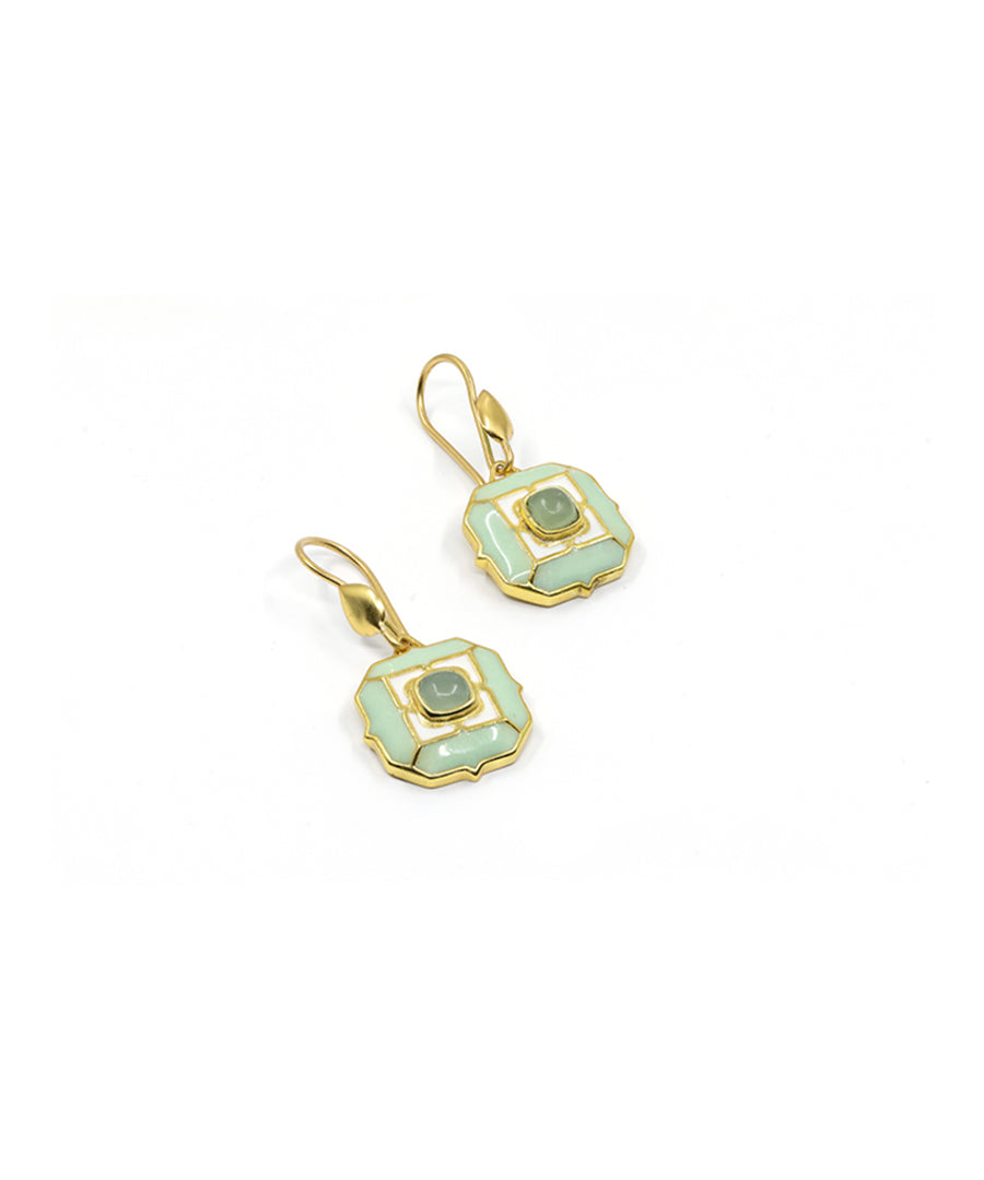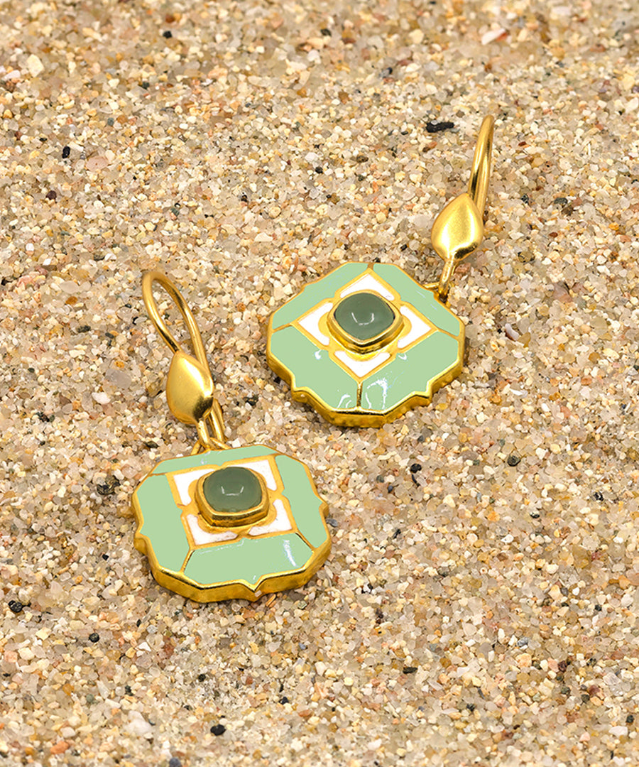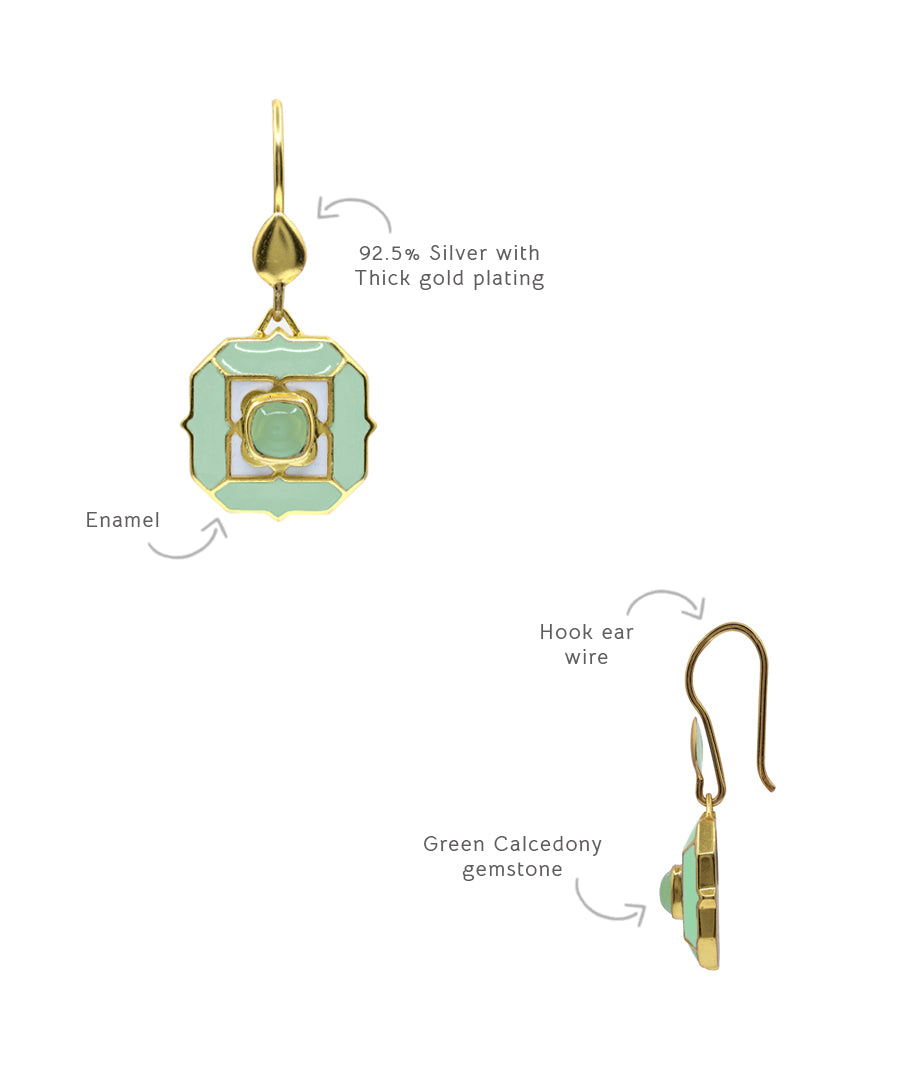 These easy to wear Sea Breeze Earrings brings a fresh pop of color to your style. These earrings are handcrafted in 92.5% silver, with thick gold plating and exquisite enameling. Adorned with green calcedony gemstone, super easy to wear with ear wire mechanism.