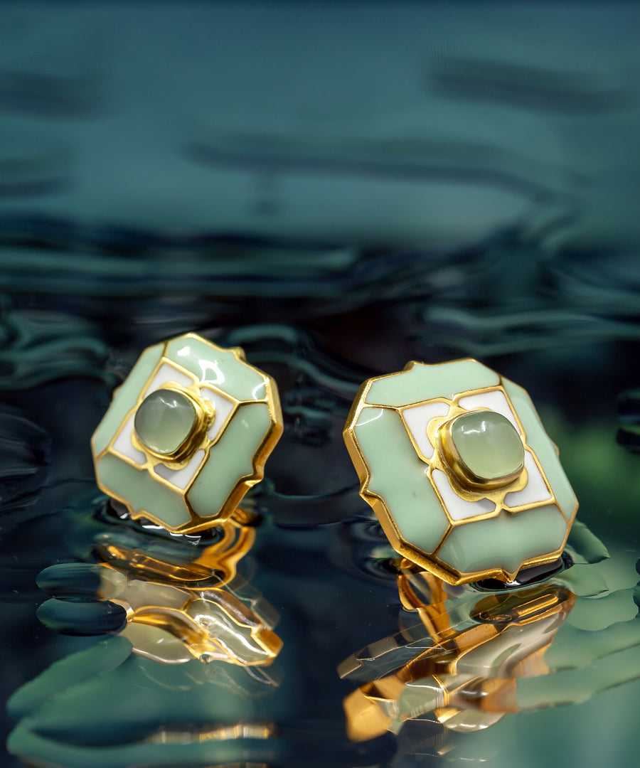 The Foggy Green Sherwani Button is handcrafted in 925 silver, with thick gold plating enamelled with pastel green hues. These buttons can be worn with jacket, jodhpuri , achkan or sherwani. It can be worn with the help of a ring at back which can be fixed or detached easily by you, the button has an inlay of natural gemstone called green calcedony. Enquire for styling suggestions.