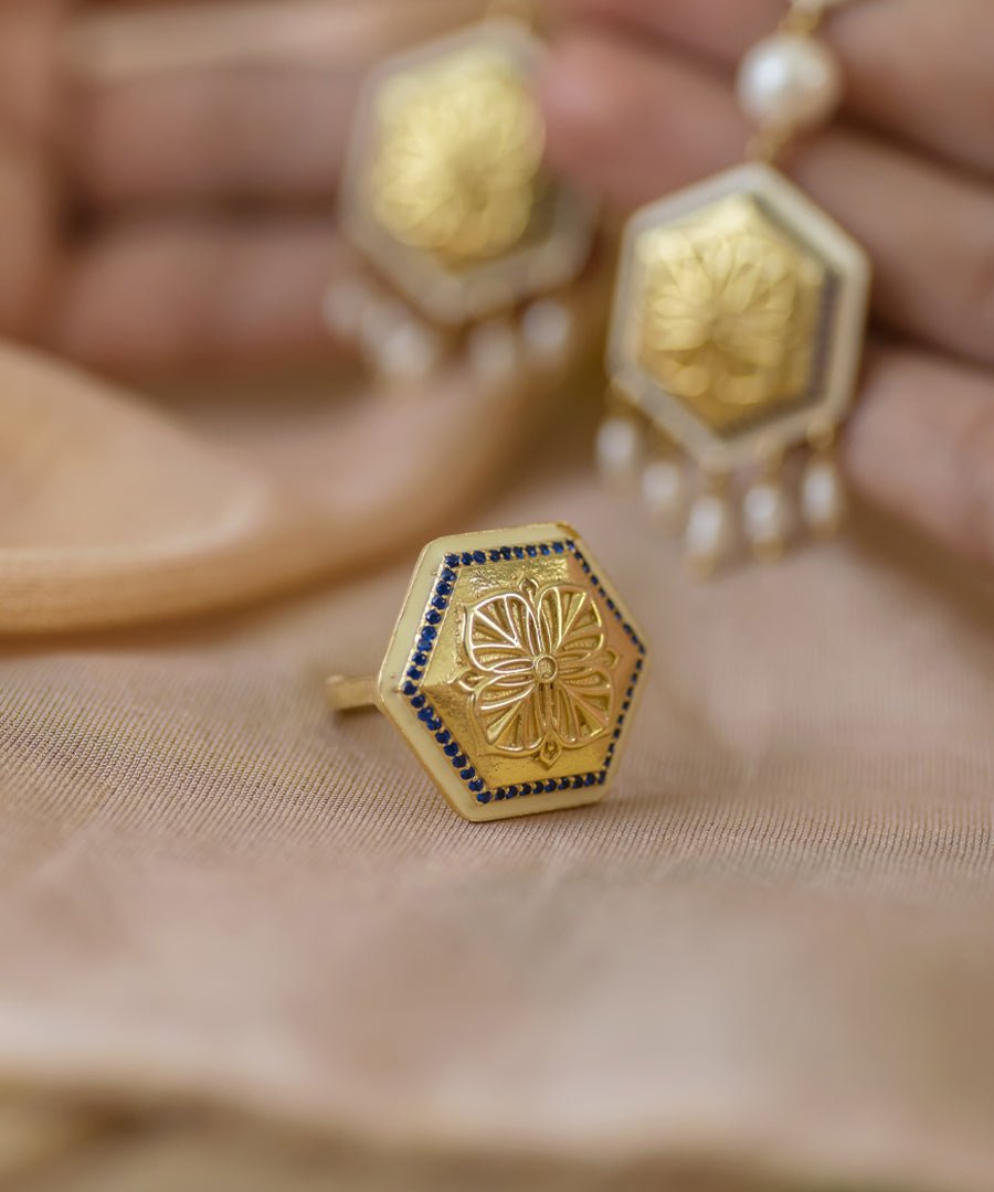 Elevate your style with the exquisite Magnolia Ring, crafted in 92.5% silver has a enamelling details, featuring a beautiful blue zircons along the border. Adjustable for the perfect fit, plated in gold with a protective coating for lasting shine.