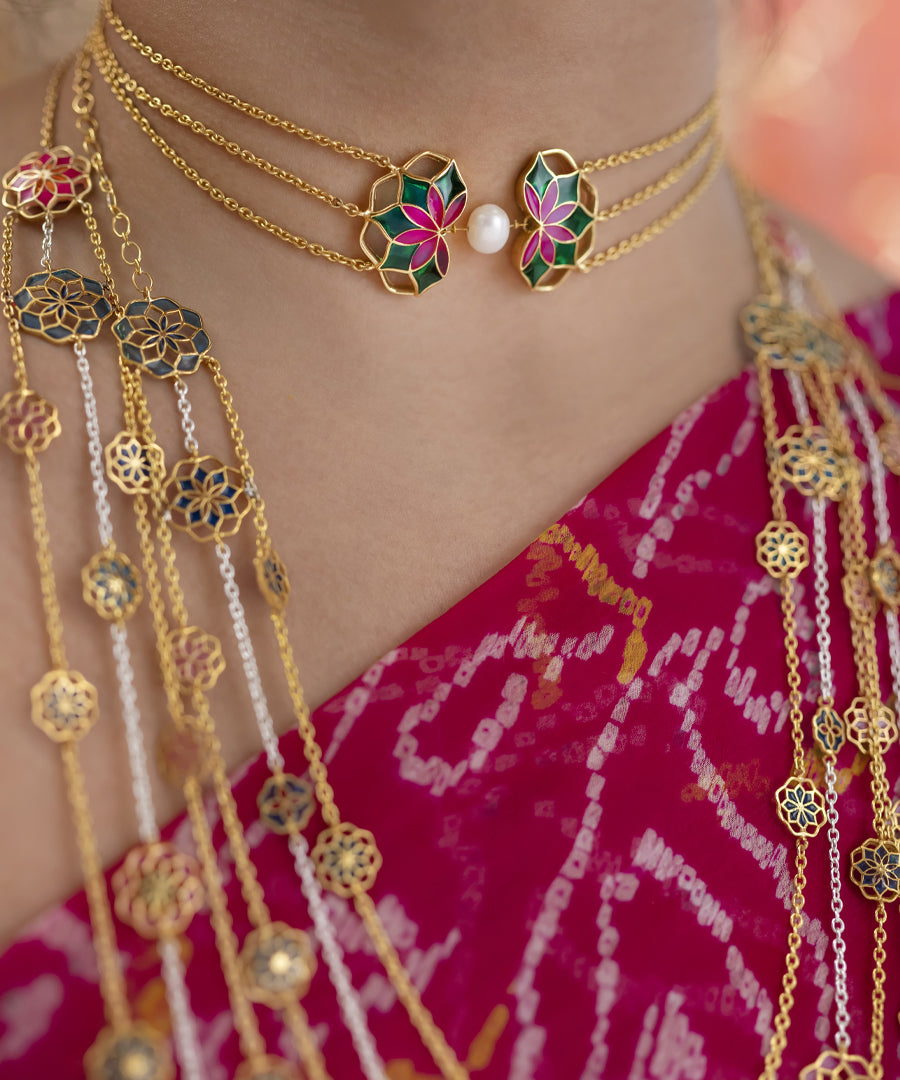 Mystic motifs inspired by the falling flowers, frozen like a moment in time. The radiance of plique-à-jour enamel brings out the vibrancy and playfulness of gulmohar flowers.