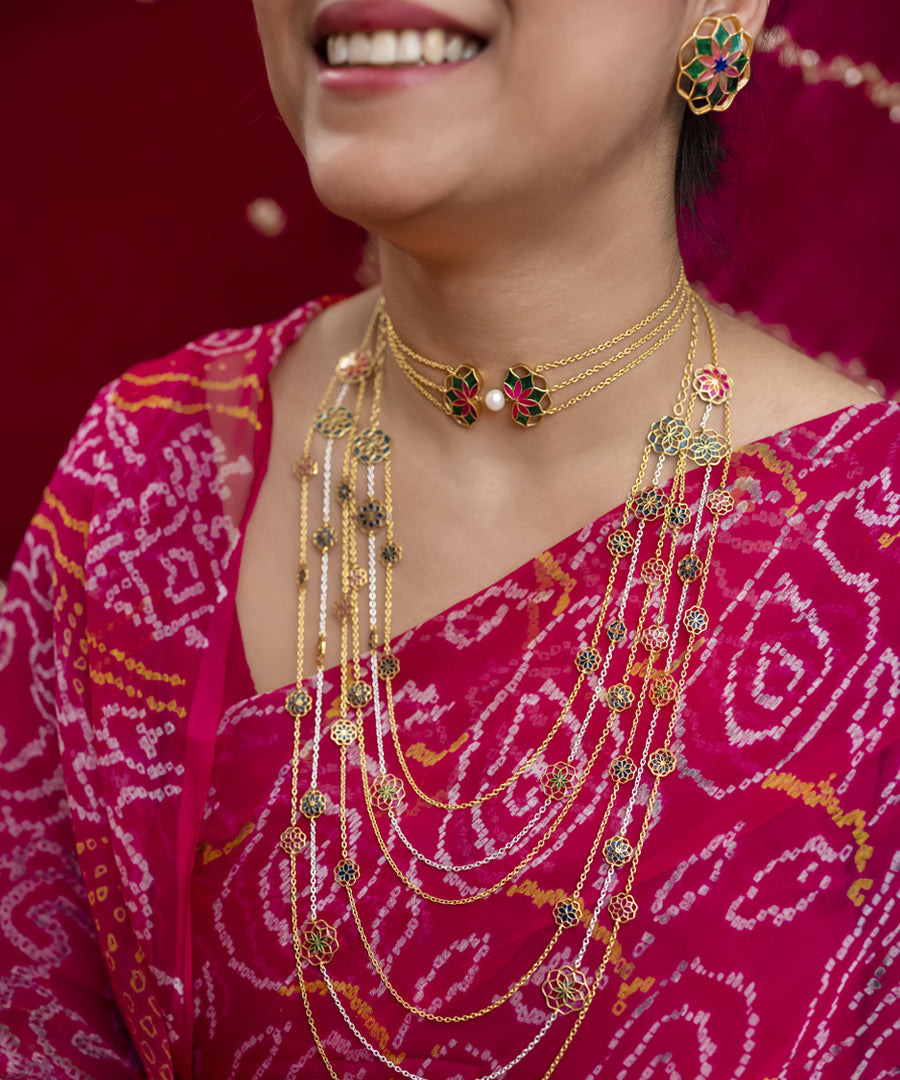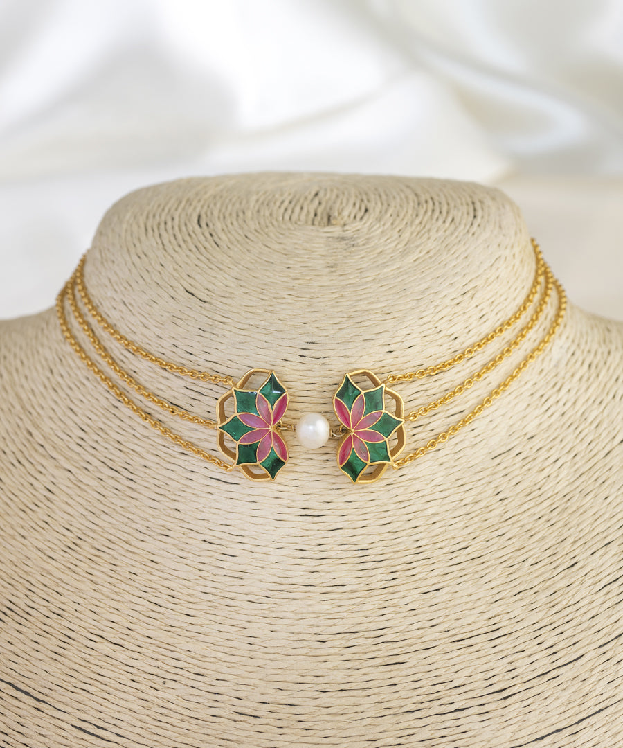 Gul Choker Necklace with Pearl- Emerald Green and Pink Enamel - Adjustable Chain