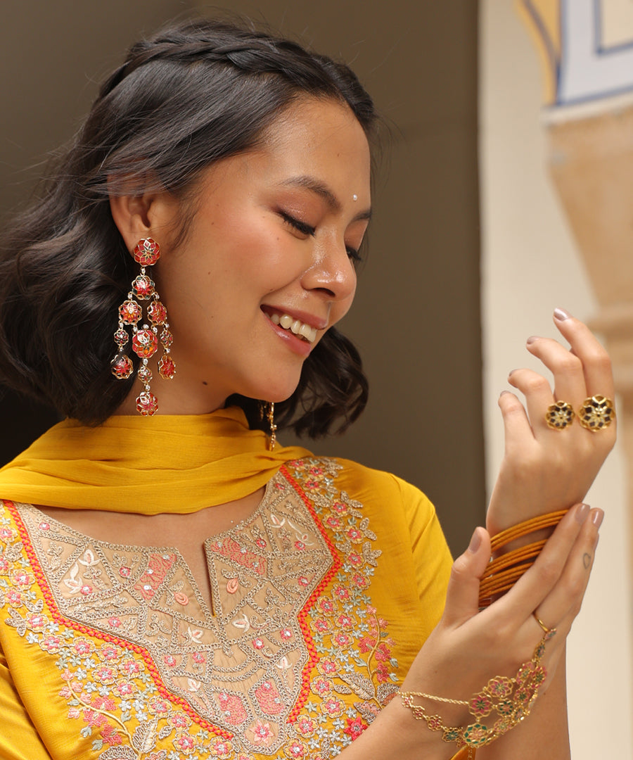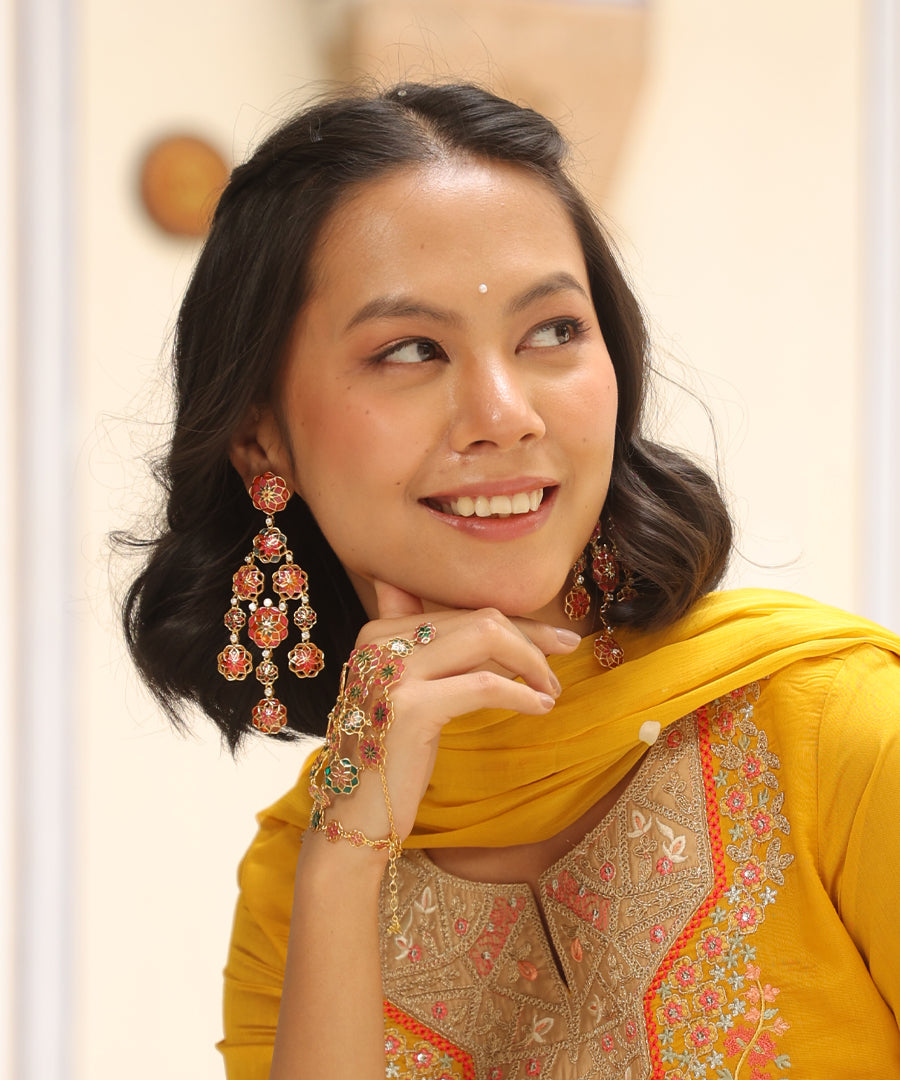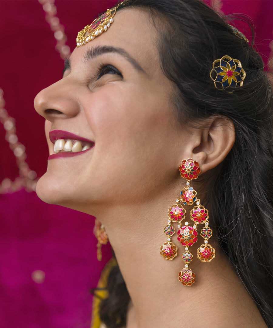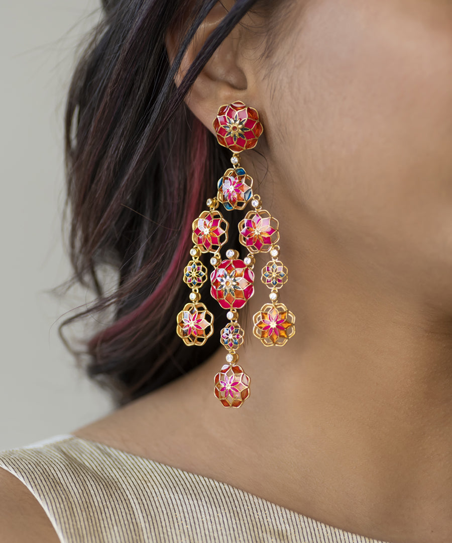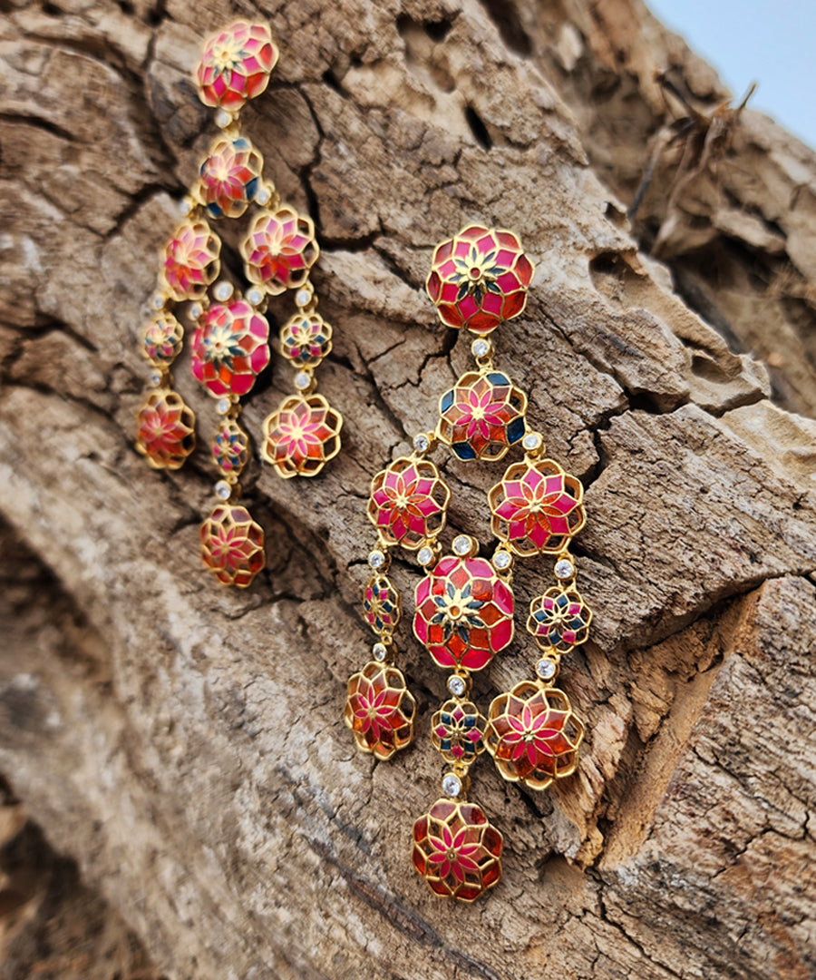 Mystic motifs inspired by the falling flowers, frozen like a moment in time. The radiance of plique-à-jour enamel brings out the vibrancy and playfulness of gulmohar flowers.
