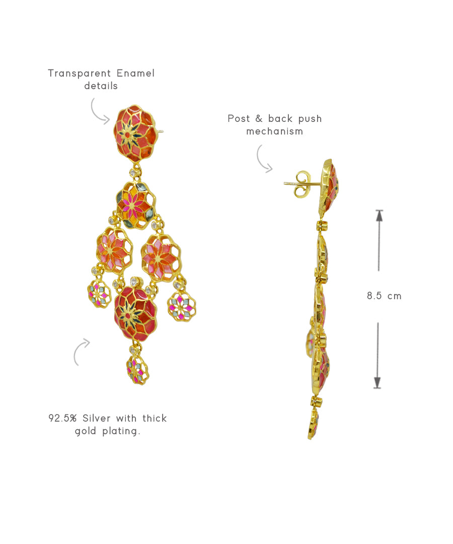 These Gul Phool earrings are handcrafted in 92.5% sterling silver, with thick gold plating. These earrings has a transparent enamel details in vibrant colors with flower motif design. These earrings has post and push back mechanism for easy wear.