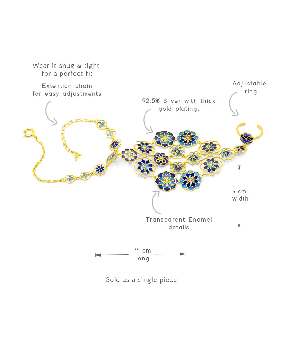 The haathphool bracelet with transparent enameling or the intricate design of flower motif can elevate your look instantly, it has a J-lock that can be fixed easily by you. This haathphool bracelet is handcrafted in 92.5% sterling silver, with thick gold plating. Sold as a single article, please select qty 2 for pair.