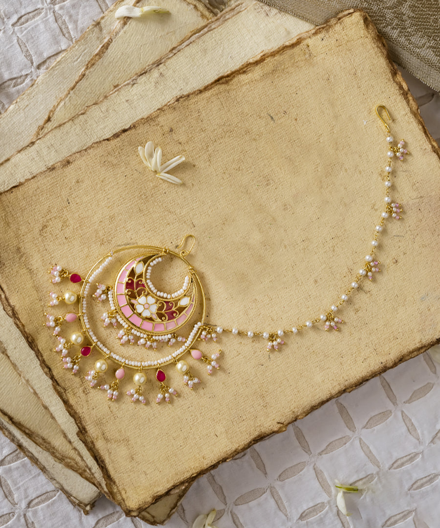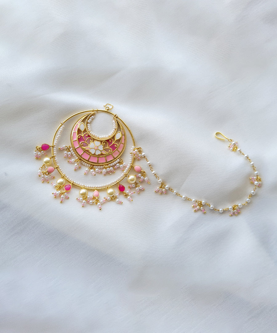 This designer nath features intricate enameling work that highlights its delicate motifs with vibrant color and fine detailing. Graceful hanging pearls and beads add a touch of timeless charm and subtle movement, creating a truly captivating piece.