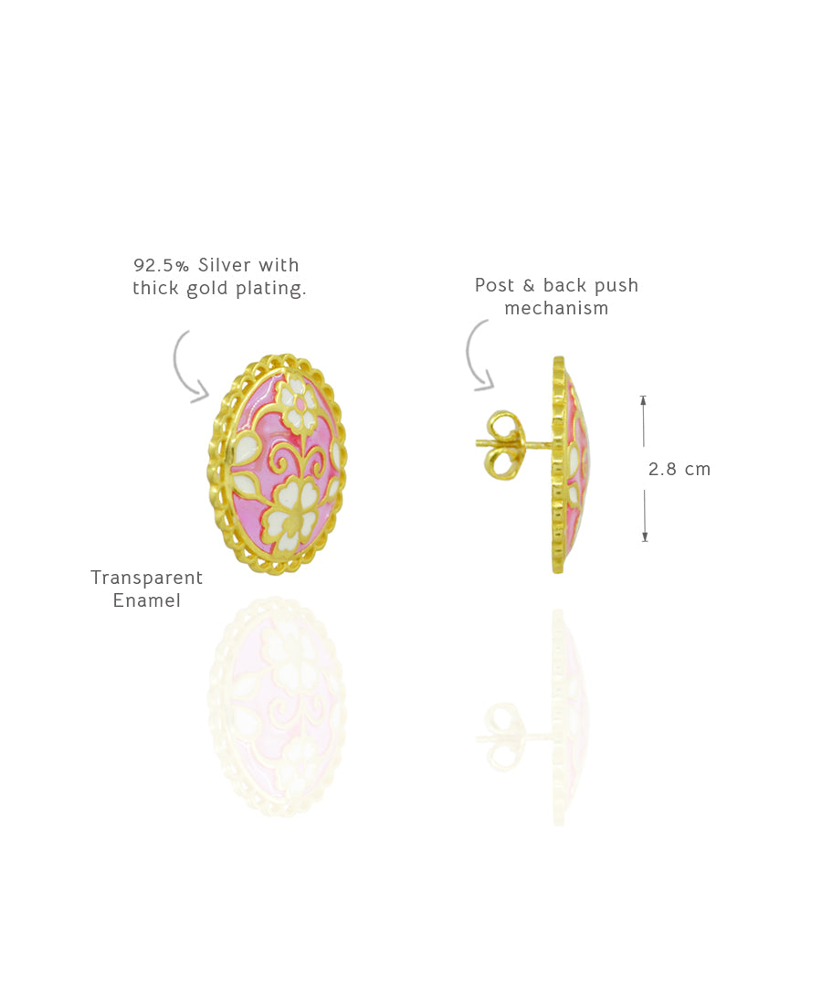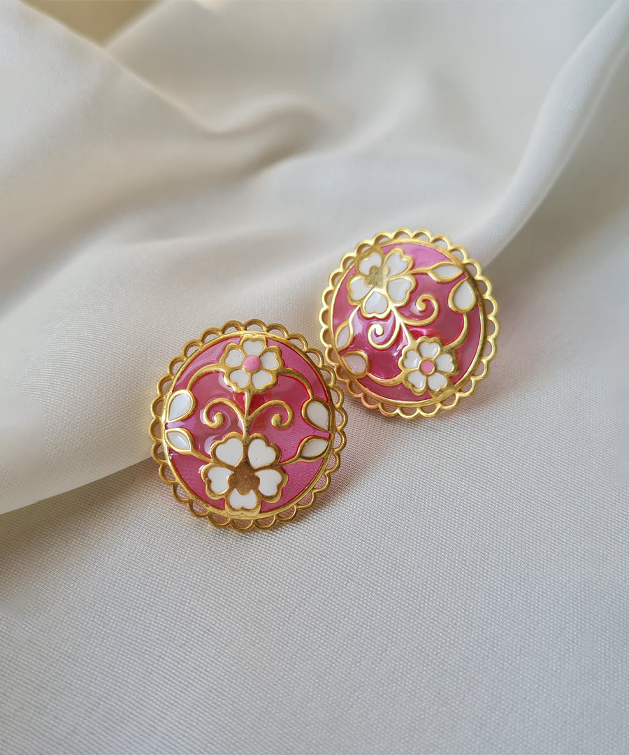 Delicate yet bold, these Gulaabi Keerat stud earrings are handcrafted in 925 sterling silver with thick gold plating and intricate enamel work. The soft pink base is adorned with ivory and gold floral motifs. The scalloped gold border adds a charming vintage finish, making them the perfect blend of heritage elegance and everyday sophistication.