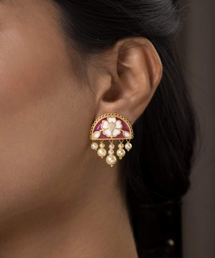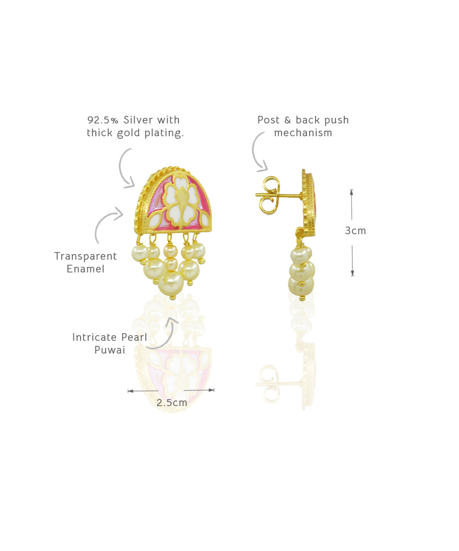 These Gulaabi Chand Stud earrings are handcrafted in 925 sterling silver and finished with a rich, thick layer of gold plating. Adorned with intricate pink & ivory enameling. Delicate hanging pearls add a graceful touch, making them the perfect fusion of traditional craftsmanship and timeless sophistication.