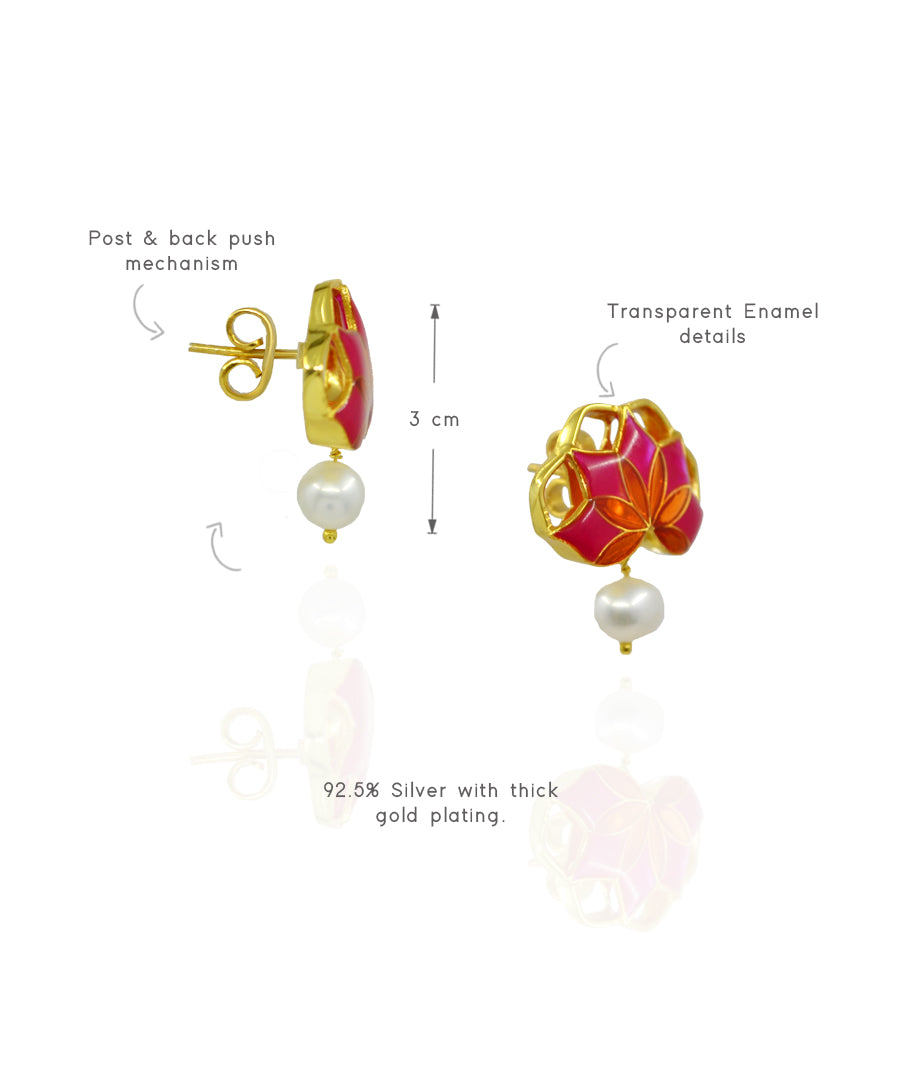 These Gul half earrings are handcrafted in 92.5% sterling silver, with thick gold plating. These earrings has a transparent enamel details in vibrant colors with flower motif design and hanging pearl. These earrings has post and push back mechanism for easy wear.