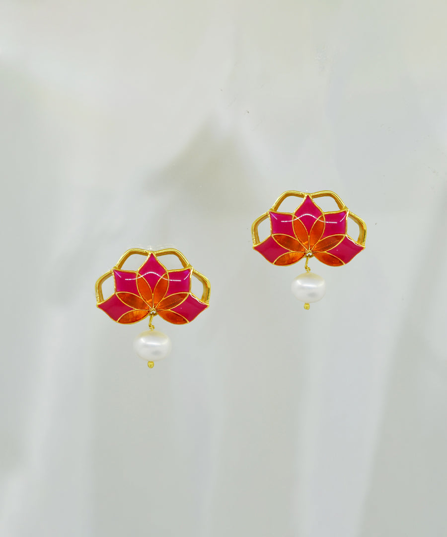Gul Stud Earrings with Pearl - Hot Pink and Orange Meenakari Enamel