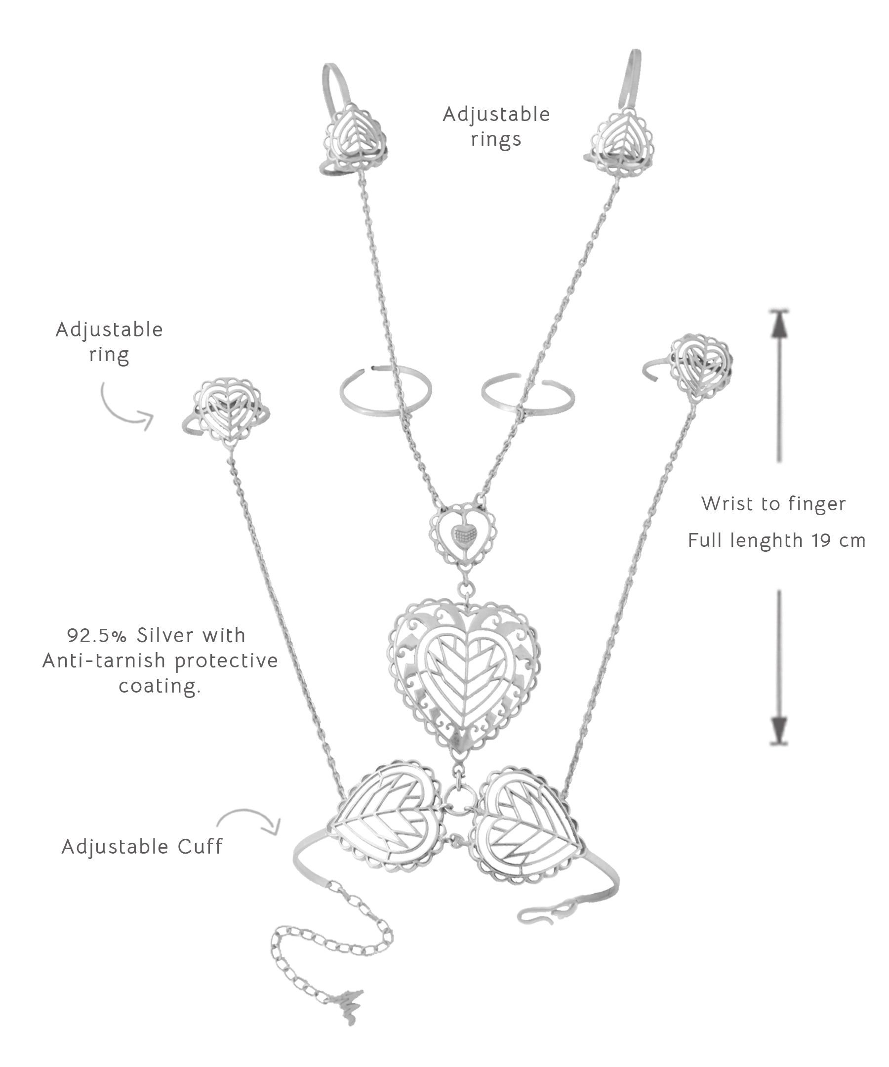 Silver Heart Hathphool Exquisitely handcrafted in 925 sterling silver with anti-tarnish protective coating, this hathphool features a regal arrangement of intricate heart motifs connected with delicate chains. Designed to adorn four fingers, it balances elegance and tradition with modern artistry. The detailed heart motifs add a graceful charm, making it a perfect statement accessory for weddings, festive occasions, and special celebrations.