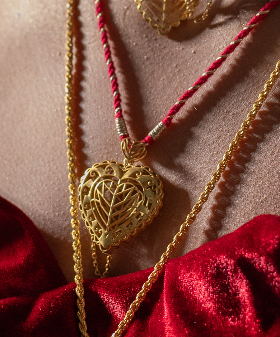 A statement openable choker, handcrafted in 92.5 sterling silver with a luxurious thick gold plating. The choker is wrapped in deep red velvet, giving it a regal touch, and finished with a delicately designed openable heart charm. Elegant yet bold, it blends traditional craftsmanship with modern sophistication.