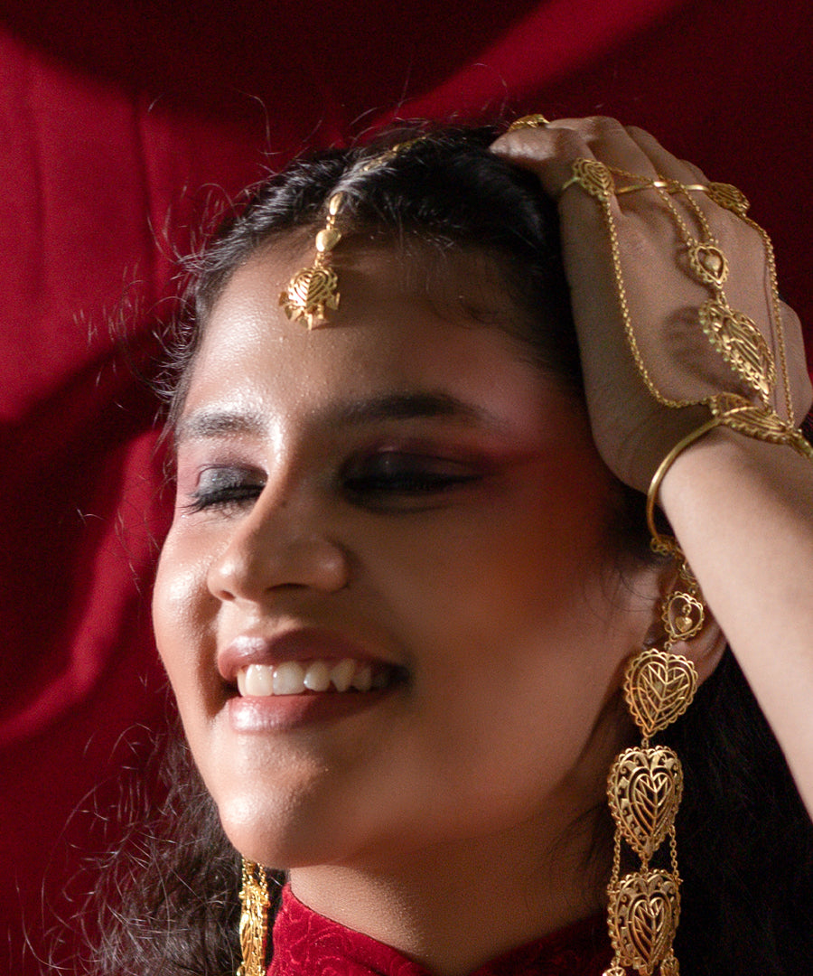 Golden Heart Mang Tika Handcrafted in 925 sterling silver with a luxurious thick gold plating, this mang tika features a delicate chain of textured heart motifs. Finished with tiny dangling elements for graceful movement, it blends timeless tradition with modern artistry. A perfect accessory to complete your bridal or festive look with elegance and charm.