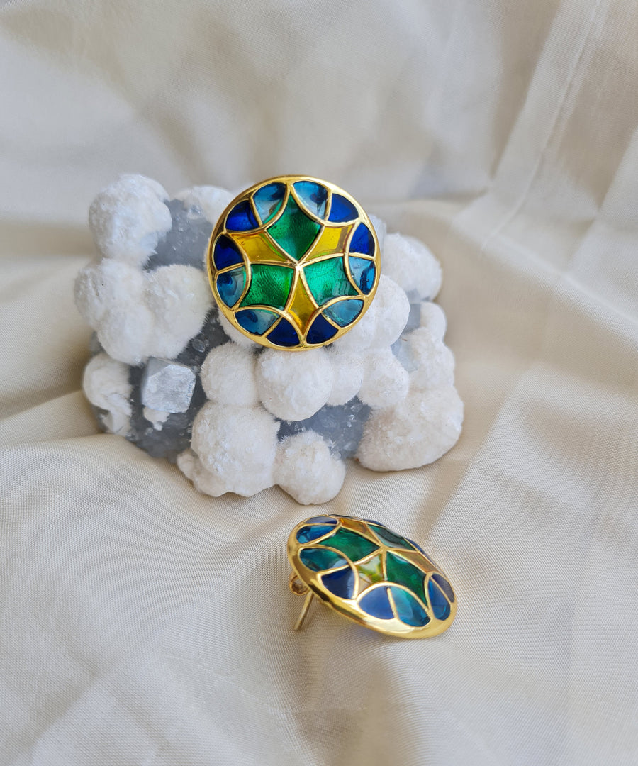 These Stud earrings are handcrafted in 92.5% silver, with thick gold plating. It has transparent enamel details in vibrant color &  has a post and push back mechanism for easy wear.