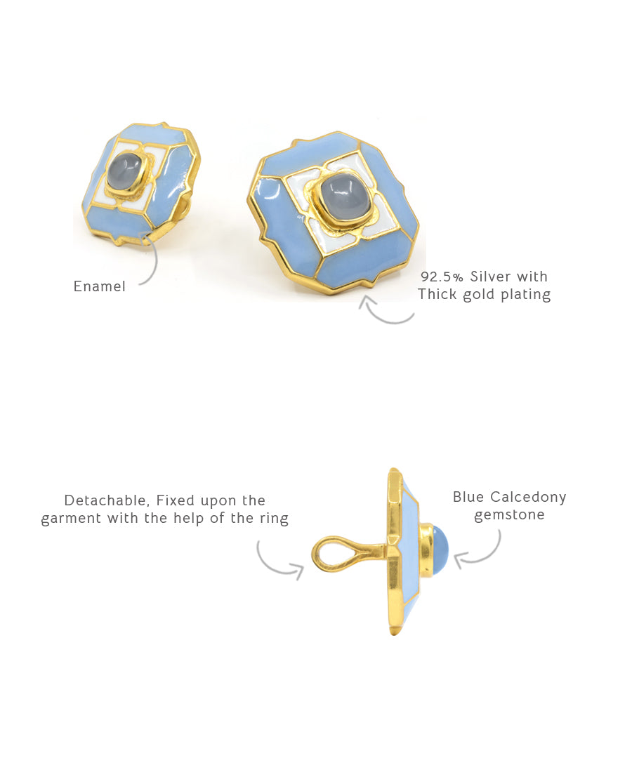 The Ripple Blue Sherwani Button is handcrafted in 92.5% silver, with thick gold plating enamelled with pastel blue hues. These buttons can be worn with jacket, jodhpuri , achkan or sherwani. It can be worn with the help of a ring at back which can be fixed or detached easily by you, the button has an inlay of natural gemstone called blue calcedony. Enquire for styling suggestions.