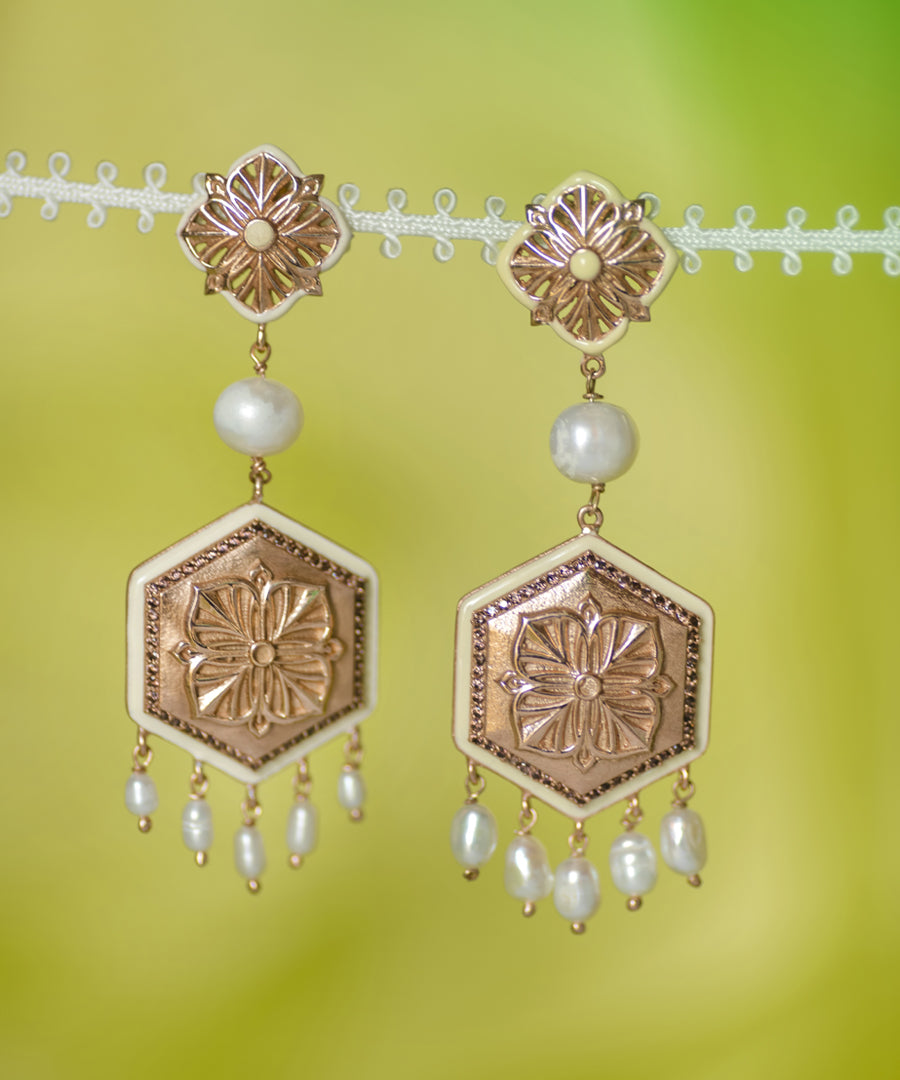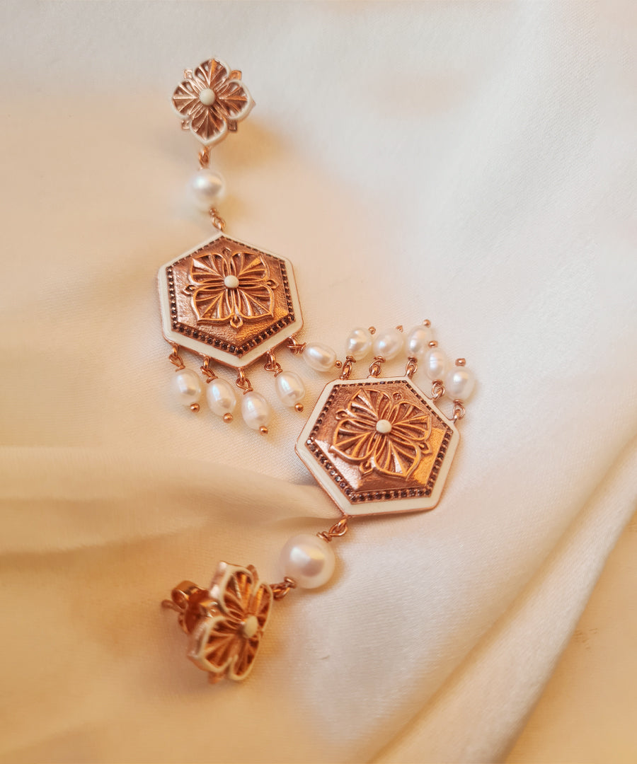 These long earrings are beautifully crafted from 92.5% sterling silver, featuring intricate enameling details and a rose gold plating. Adorned with sparkling zircons along the border and hanging beads, they also feature a pearl at the center, adding length and elegance to the design. The combination of these elements creates a chic, festive touch.