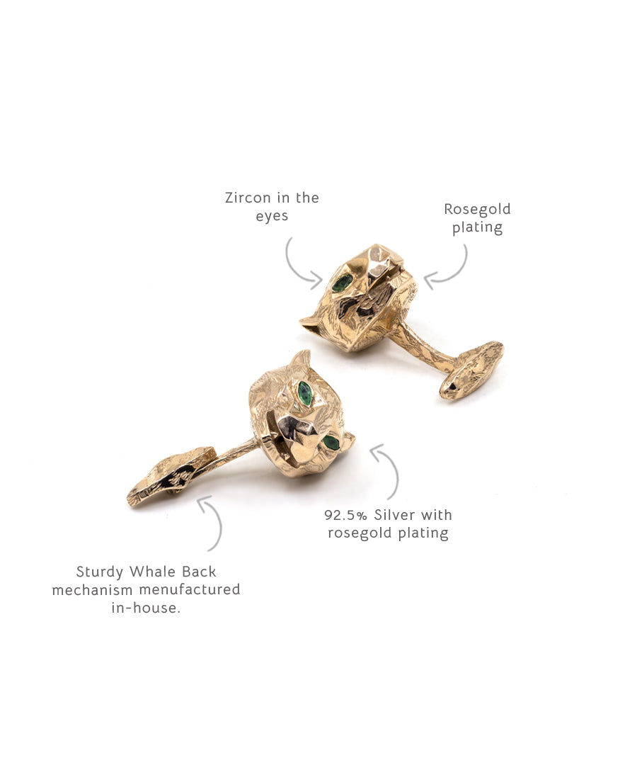 These Panther cufflinks are handcrafted in 92.5% silver, with rose gold plating, have a whale back mechanism, easy to wear with every outfit.