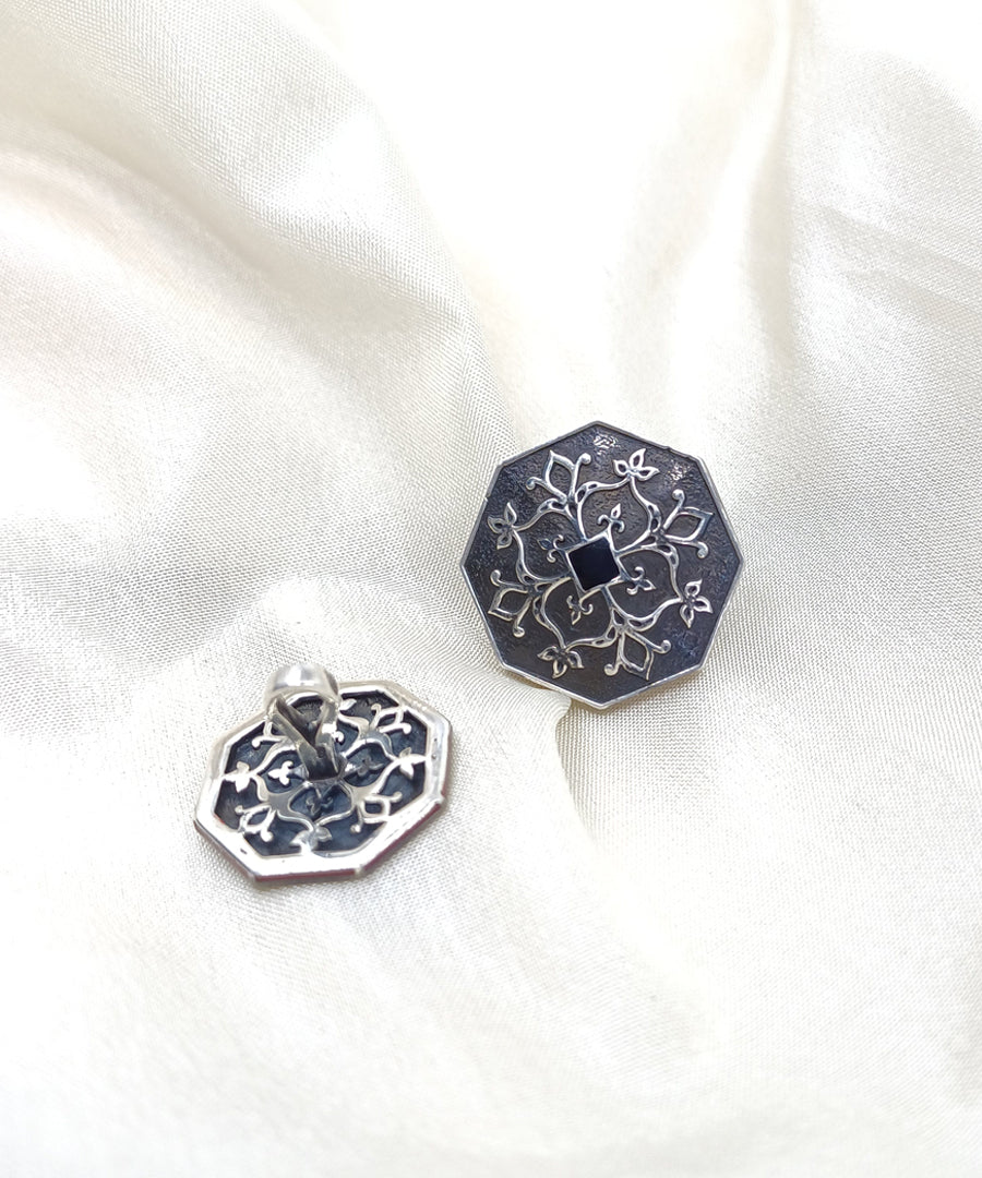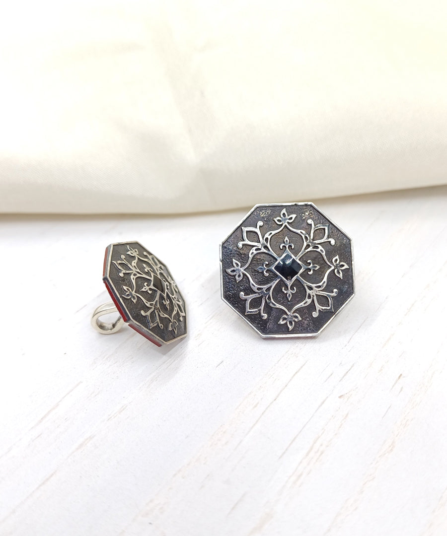 The Goonj Button is handcrafted in 92.5% silver, in oxidised finishand has anti-tarnish protective coating. It can be worn with jackets, jodhpuri or sherwani with the help of a ring at back which can be fixed or detached easily by you. A set of 3 small buttons are attached to each sleeves of achkans and jodhpuris.